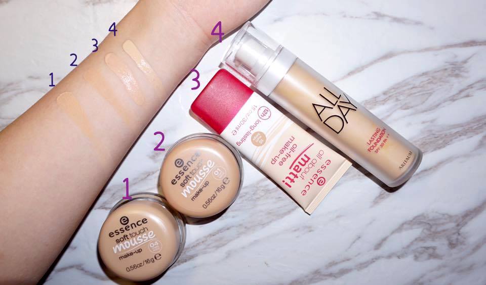 以下比較四款粉底,第一個是粉底慕斯(04)、第二個是粉底慕斯(01)、第三個是超霧感零油粉底(10matt beige)、再拿第四個正在服役的ARITAUM All Day Lasting Foundation(2號自然色)比。我覺得All Day的粉底液在我臉上偏白,可供大家比色參考