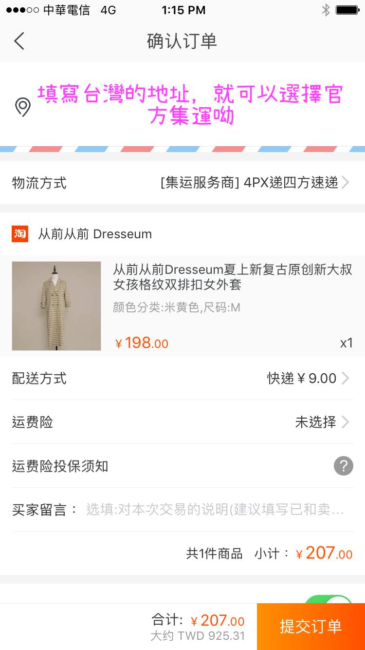 我使用4PX的官方集運,在購買時填寫台灣的地址,結帳時就可以選擇官方集運,等到貨品到集運地時,4px會寄簡訊通知貨物已經入庫,一樣可以等多項貨品到集運地,再合併計算公斤數,結算運費,一起寄回來台灣。