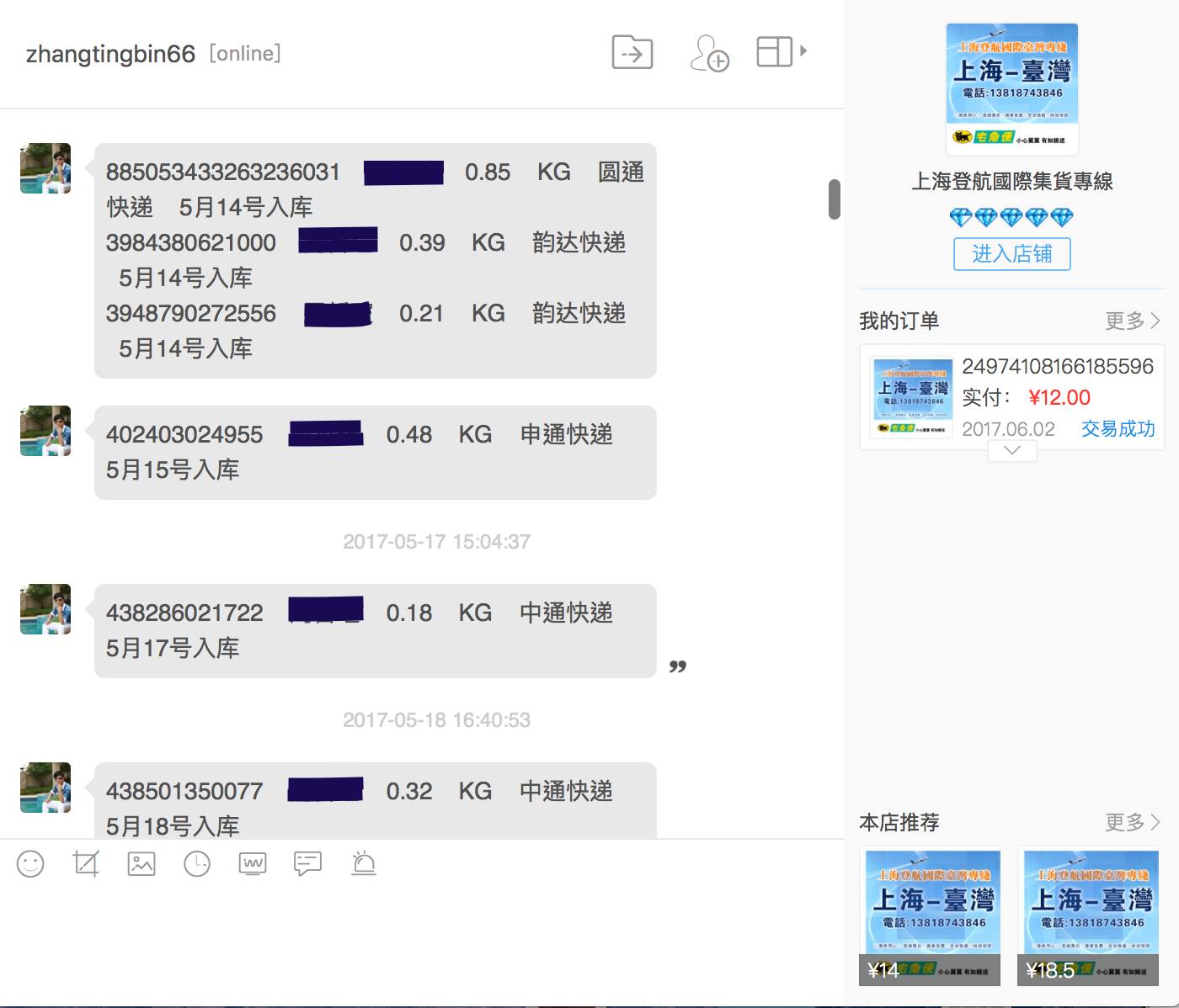 當一件一件貨物寄到他的集運地後,他會傳貨號、公斤數和入庫時間給你,貨品可以在集運地存放30天。