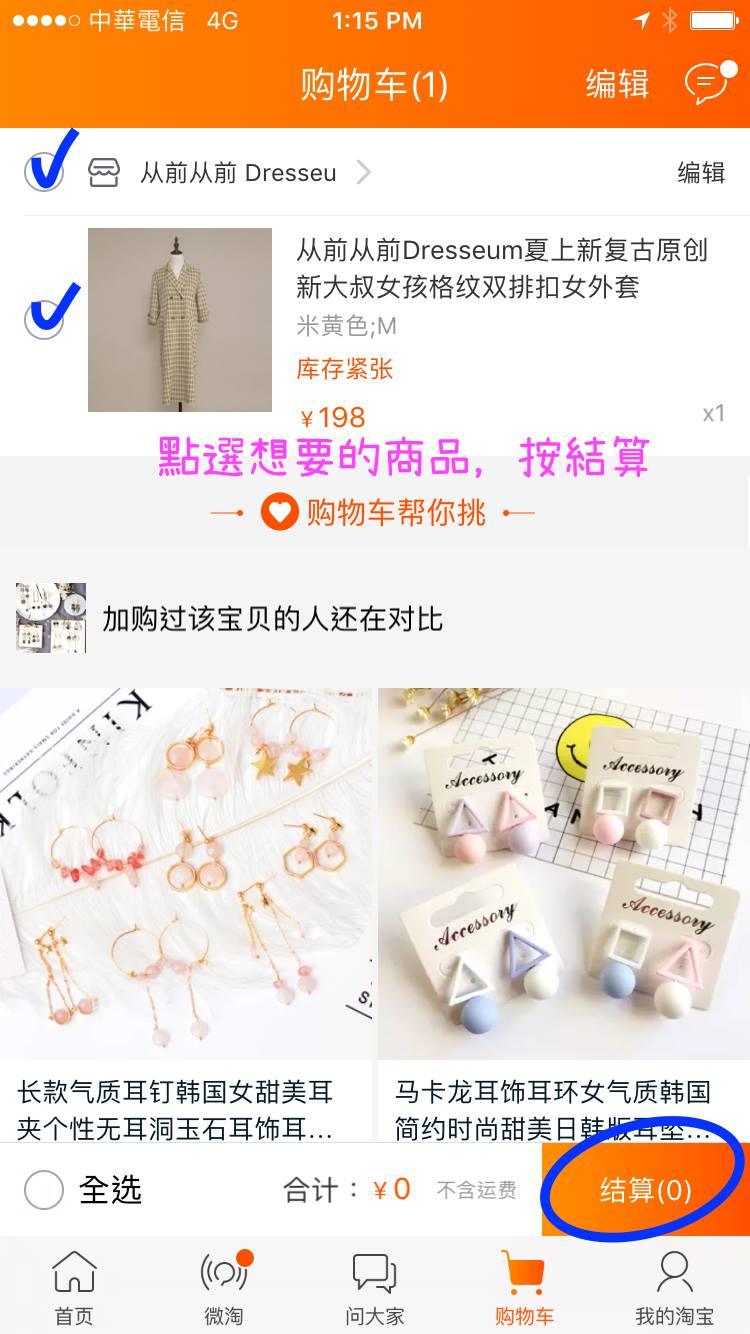 要結帳時,進到購物車,點選商品,再按結算。